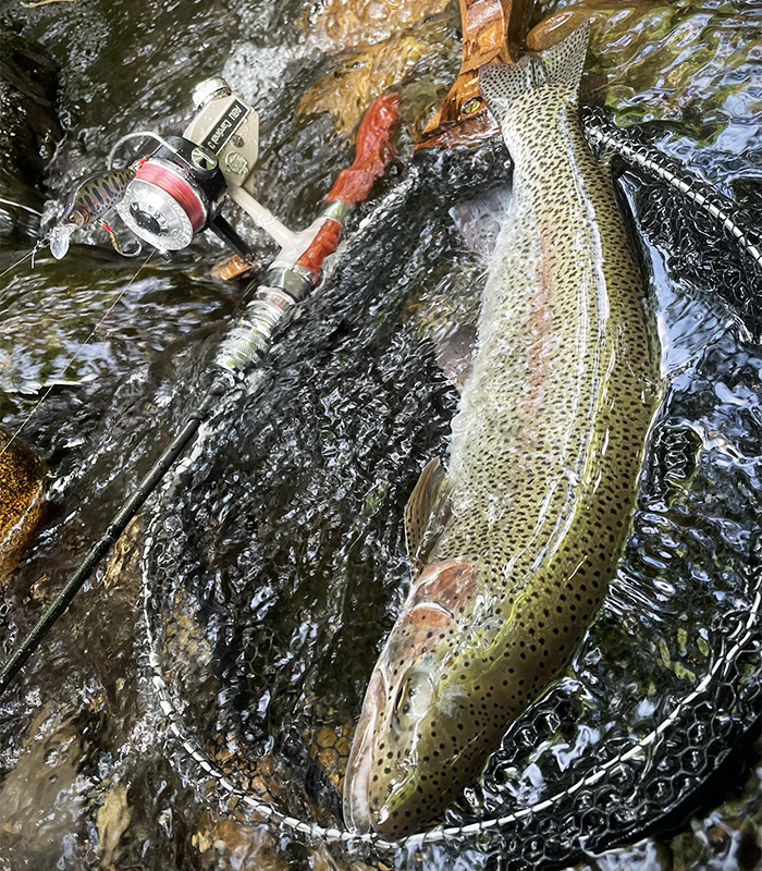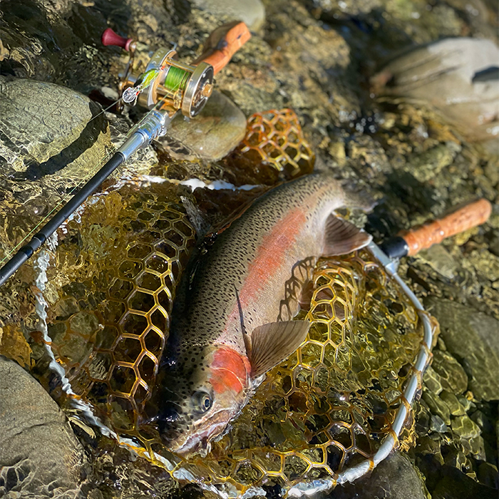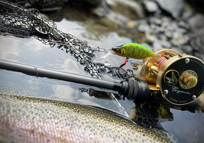 私の釣りのスタイルは、小型ミノー(およそ4〜5cm)を使い、渓流ベイトフィネスまたは5〜6フィートクラスのスピニングロッドで、ピンポイントにキャストしてトラウトの鼻先にルアーを送り込む繊細な釣りです。湖、本流での遠投とは違い、渓流の狭い流れの中で、鱒が定位するわずかなスポットを狙い撃つ ── そんな精密な釣りを好んでいます。